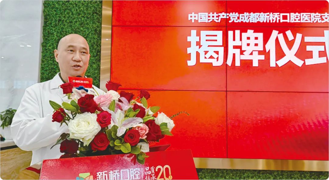 揭牌儀式上,華西種植專家/新橋口腔成都玉雙院區業務院長劉果生代表新橋口腔,向蒞臨現場的領導介紹了新橋口腔的發展歷程、學科建設、團隊建設和開展的慈善公益等情況。