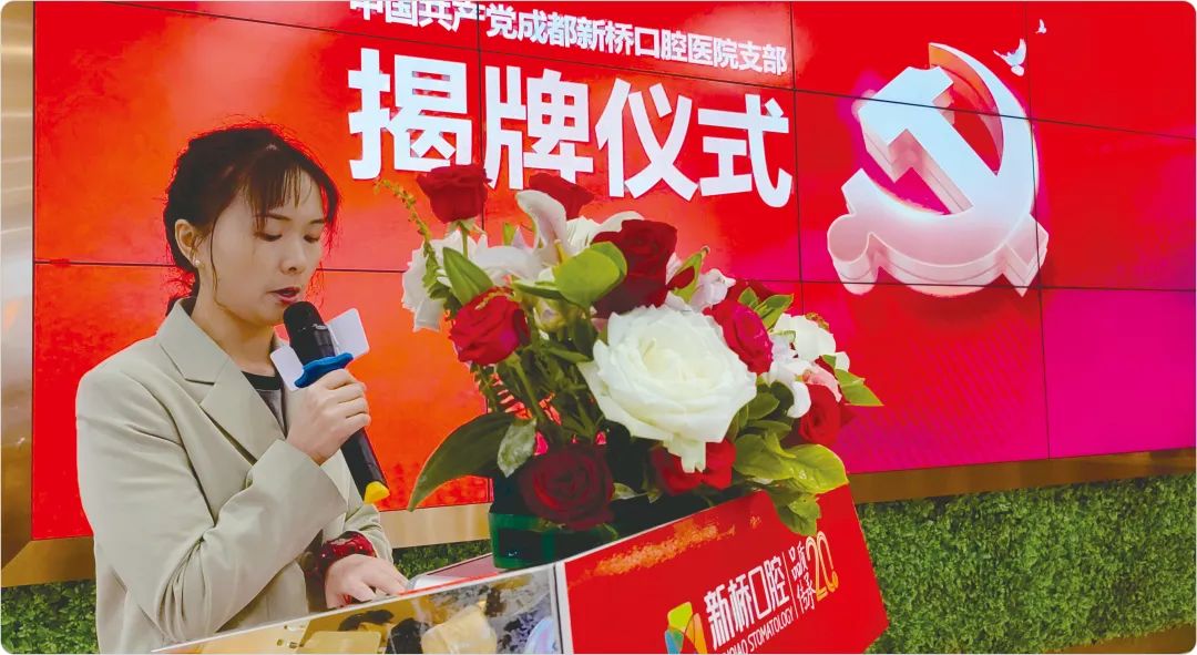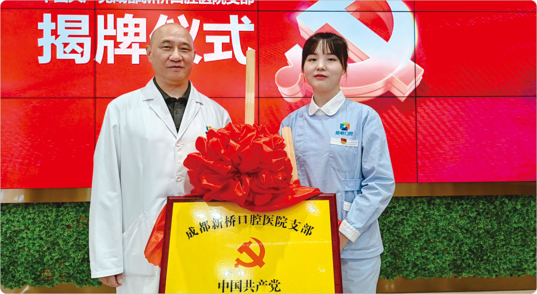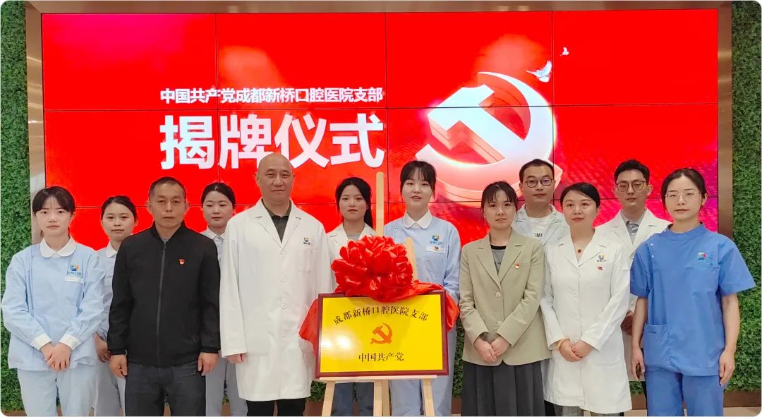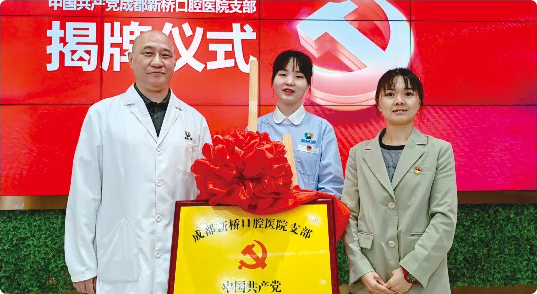 為進一步加強新橋口腔黨組織建設,用高質量黨建引領企業高質量發展,在成都市武侯區漿洗街道蜀漢街社區和各級黨委的關懷、指導下,新橋口腔于今日上午正式舉行黨支部成立揭牌儀式。成都市武侯區漿洗街道蜀漢街社區黨委副書記高桂華、華西種植專家/新橋口腔成都玉雙院區業務院長劉果生、新橋口腔第一屆黨支部書記蔣越等相關負責人出席本次儀式。