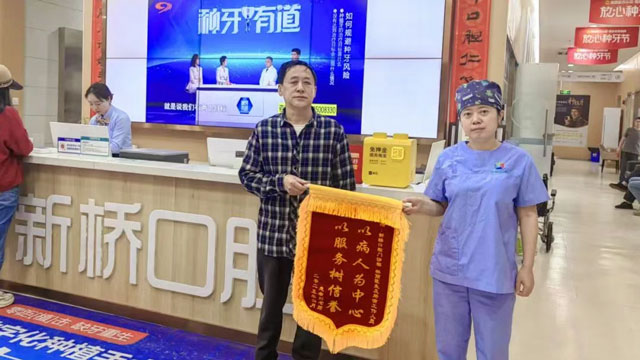 近日,新橋口腔自貢院區種植顧客劉叔叔在完成種植牙術后復診時,將一面寫有“以病人為中心,以服務樹信譽”的錦旗送到林麗醫生及其團隊手中,言語中滿是感激與喜悅。他感慨道:“在這里就診就像回家一樣,感謝你們讓我重享美食。”