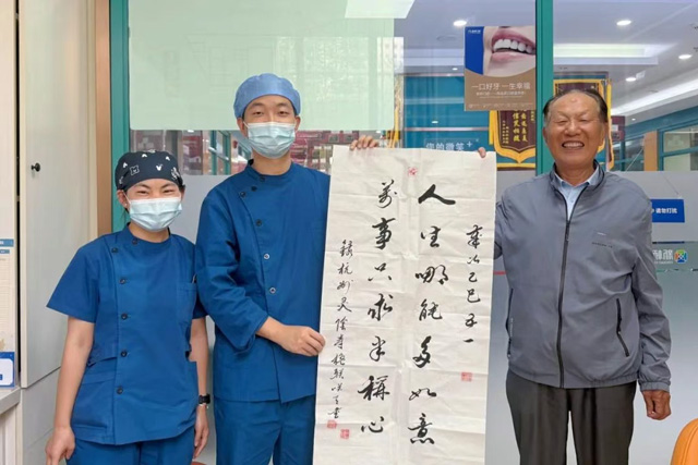 日前,新橋口腔西寧院區種植專業組副主任黃清川收到了一幅墨香四溢的書法作品。作者李秋成叔叔今年84歲,是新橋口腔西寧院區的一位種牙回頭客。 初次結緣:重獲口福,信任由此生根 回……