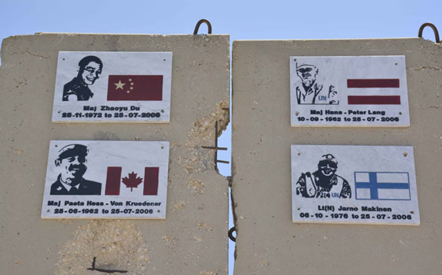 2015年清明節(jié),我和戰(zhàn)友去了營(yíng)地十多公里外的一個(gè)紀(jì)念碑,那里原來是個(gè)觀察哨。2006年,聯(lián)合國(guó)停戰(zhàn)觀察組織駐黎觀察團(tuán)的四位觀察員在該處執(zhí)行任務(wù),遭到以色列的威脅和驅(qū)趕后撤入地下掩體,隨后以色列發(fā)動(dòng)襲擊,飛機(jī)投彈落在掩體上方,四人全部犧牲,其中包括一位中國(guó)中校。每年清明,中國(guó)維和人員都會(huì)前去祭奠。